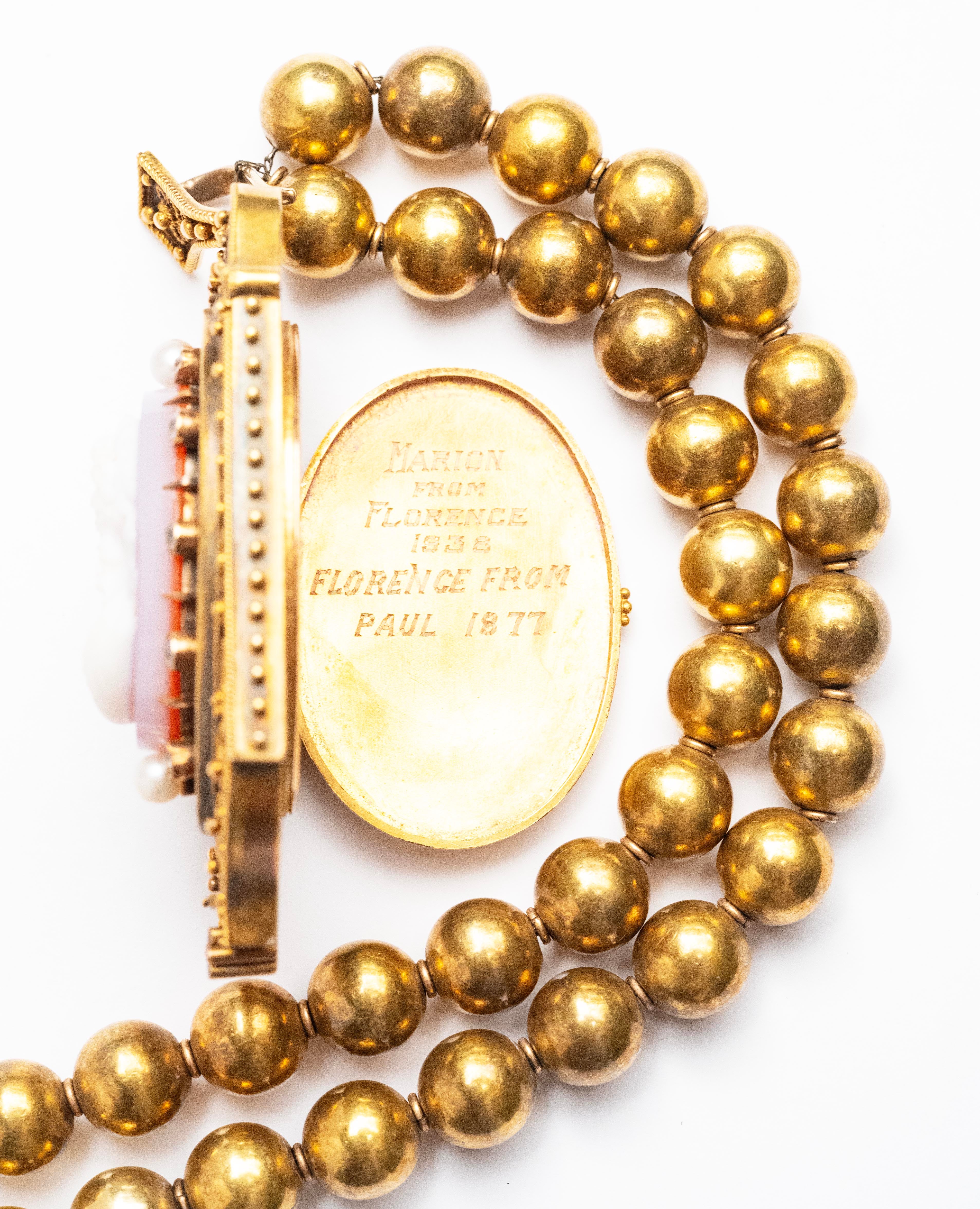 Early Victorian 20K banded agate cameo with rose-cut diamonds and pearls. The cameo is a locket accompanied by gold-filled beads. Cameo with bale measures 3" x 1 1/2" and the gold-filled beads measure 18" in length. Contact Bijoux for more information.