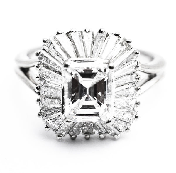 This is a platinum and diamond Ballerina ring. The center stone is a 1.0 ct. G-H VS2 Emerald Cut diamond. Contact Bijoux for more information.