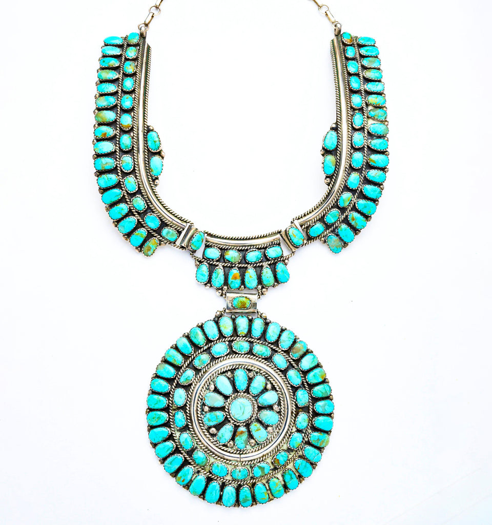 Large Signed Navajo Turquoise and Sterling Squash Blossom Necklace